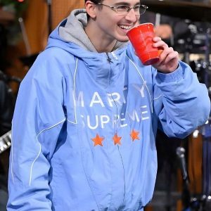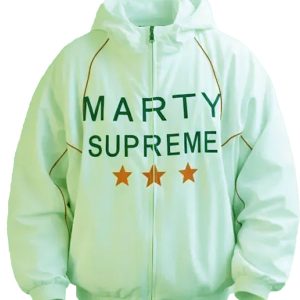 Dark Blue Marty Supreme Jacket is the final selection if you seek the most “screen-accurate” and rarest look. Traditional sports warm-up gear from the mid-20th century is being reminded of by this deep navy shade. It gives a classy look. very grounded look that can be matched easily with either denim or light-colored chinos. The navy color sets a fantastic stage for the classic white piping and striking “Marty” lettering. which makes it the most harmonious item in the collection for lovers of subtle opulence.